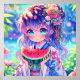 Bonito aquarela ai arte representando uma anime bonitinha com cabelo roxo comendo melancia em um dia quente de verão.