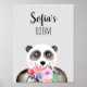 Este lindo e feminino cartaz infantil apresenta um adorável urso panda pintado à mão segurando um buquê de flores. Este desenho floral em aquarela também apresenta um espaço para você adicionar o nome da sua menina. Perfeito para qualquer quarto de criança ou berçário!