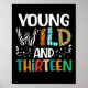 Engraçado, jovem selvagem e treze roupas para garotos e garotas. Design gráfico de 13 de aniversário bonito para a moça e o garoto celebrarem a festa de aniversários em estilo. Faz uma ideia excelente presente para animais safari amantes de um filho de 13 anos, filha, irmã, irmão... Décimo terceiro 13 de roupa para a garota e o garoto que está fazendo 13 anos. Legal roupa com uma citação engraçada, jovem selvagem e treze para crianças que amam animais da floresta e camisetas na moda.