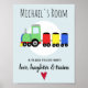 Este design fofo é parte de uma coleção com desenhos de transporte fofos para roupas e acessórios de meninos e meninas. O design apresenta um trem locomotivo colorido desenhado à mão em cores primárias sobre azul pastéis com as palavras 'o quarto do ___ está cheio de amor, risadas e trens', que pode ser personalizado com o nome do seu menino. Perfeito para o quarto de um pequeno amante de trens ou decoração de berçário! Confira nossa loja para designs de meninas.