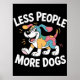 Este gráfico humorístico apresenta um feliz cão de desenho animado multicolor, com manchas de amarelo, rosa e azul, alegremente trotando com a língua para fora. O texto branco em negrito no topo lê "MENOS PESSOAS" e "MAIS CÃES" no final, expressando uma preferência relativa pela companhia canina em relação à interação humana. O design é colocado contra um fundo preto sólido, fazer as cores vibrantes pop. Download digital apenas para uso pessoal.