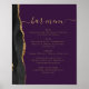 Um sinal elegante para o seu menu de bar de casamento. As palavras "menu bar" aparecem na caligrafia dourada com hastes no início e no fim, com texto personalizável abaixo. Uma aquarela preta agata design aparada com brilho dourado faux decora a borda esquerda em um fundo roxo. Veja a nossa coleção para o convite de casamento e o diário de papelaria.