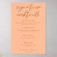 Peach é a nova cor de tendência para um evento de verão com um bar aberto. O poster do cardápio dos nossos doces coquetéis de pêssego apresenta um elegante roteiro marrom-claro detalhando suas bebidas para um evento moderado e tendencioso da tarde. impressão excelente para uma noiva feminina que adora permanecer atual e moderna.