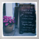 Fotografia de uma visão francesa quintessencial: menu de quadro manuscrito ao lado de um gerânio rosa pontiagudo. Isto seria uma adorável impressão da cozinha :) Localização: Belle-ille (Ilha de Belle), França. Copyright © Kate McKenna. Todos os direitos reservados. Ilegal de usar ou duplicar sem permissão.