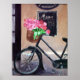 Uma pintura original de um cenário de um país francês. Uma bicicleta com uma cesta de flores rosa brilhantes em frente a um restaurante.