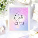 Direcione seus convidados para a mesa de presentes com este letreiro elegante com um fundo gradiente de brilho rosa e roxo com gradiente holográfico. Perfeito para criar um tema de decoração coeso e elegante no seu chá de noiva.