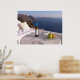 Esta é uma mesa em Santorini na nossa sacada particular, a olhar para a caldeira. Eles nos trouxeram vinho e uma placa de fruta.
