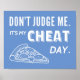 Você deve se sentir livre para comer a comida de lixo que você quer de vez em quando depois de todo aquele treinamento e dieta sem nenhum julgamento dos outros. Este design proclama isso com sua legenda humorística que diz "Não me julgue. É o meu dia da trapaça." e uma fatia de pizza com pepperoni e queijo saindo ao lado para ilustrar a ideia.