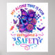 Design vibrante e colorido com um crânio com borboletas, rosas e um morcego voador. O texto colorido diz: "O meu tempo é para a segurança de todos". Esse design está disponível em uma grande variedade de produtos.