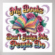 Uma design vibrante e colorida mostra um livro aberto, rosas, formas em crescente e estrelas. O texto em negrito diz, "Meus livros não me julgam, pessoas acreditam." Esse design exclusivo está disponível em uma grande variedade de produtos.