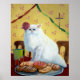 A beautiful white cat adorned with a flower in its hair, sitting proudly before a plate of delicious pan dulce. Inspired by traditional Mexican folk art, the warm yellow wallpaper background adds a joyful, cultural touch to this charming scene.