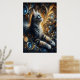 Uma pintura vibrante capturando a essência de um gato contra um fundo preto em greve, mostrando seu comportamento gracioso e seu olhar intenso.