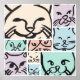 A simple and expressive set of cat faces drawn in bold black lines on soft pastel backgrounds. Clean, modern, and playful.