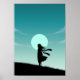 Bring a peaceful yet powerful energy to your space with this minimalist anime girl poster. Depicted as a clean black silhouette with long flowing hair and a gently blowing scarf, she stands on a grassy hill under a pale teal sun against a soft teal-to-blue gradient sky with faint drifting clouds, creating a calm dawn atmosphere. Perfect for anime lovers and aesthetic wall art collectors, this design blends Japanese anime inspiration with serene beauty, making it an elegant statement piece for your decor.