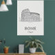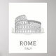 Stylized travel poster of Rome illustrated in minimalist lines. It features iconic silhouettes of Roman Colosseum, evoking a sense of timeless history.