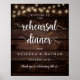 Pôster de Boas-vindas para Jantar de Ensaios de Casamento Moderno Rústico, com tema de madeira escura de cabana e luzes de corda.