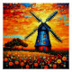 A.I. impressão criado de um moinho de vento colorido fica em meio a campos rolantes, enquanto um caminho enrolamento conduz pela paisagem luxuosa sob o céu surreal e o sol.