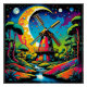 A.I.criou impressão de debaixo de um céu psíquico surreal cheio de vários corpos celestes, um moinho vibrante é rodeado por uma paisagem de vegetação exuberante, da selva, refletida num corpo de água adjacente.