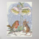 Linda arte de Molly Brett. Um rato marrom bonito está tocando seu violino enquanto um Robin segura o livro de música. Eles estão sob flores à medida que os flocos de neve caem.