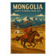 Poster de viagens vintage da Mongólia. Foreground: um cavaleiro mongol em enguias tradicionais (robe) galopando por extensas estepes de ouro, com cavalos selvagens correndo ao lado. Meio-chão: um assentamento branco redondo Ger (yurt) com ascensão suave de fumaça, cercado por colinas rolantes.