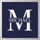 Monograma personalizado e presentes de nome que apresentam monograma branco personalizado no estilo de letra serif clássico com caixa de nome no meio do monograma em fundo azul marinho. Perfeito como decores caseiros, presentes para o lar, presentes de férias para a família, recém-casados e muito mais.