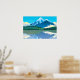 Poster num quadro digital de montanhas e florestas de pinheiros com capas de neve, refletido num lago, sob um céu azul profundo
