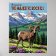 Celebrar a beleza selvagem das Montanhas Rochosas com este cartão-postal com uma ovelha bêntrica num prado alpino vibrante. Picos com capas de neve e florestas cada vez verdes completam este tributo ao estilo da vintagem à natureza e à aventura.