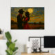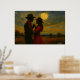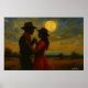 A couple dressed in Western attire shares a tender moment under a glowing full moon. The vivid colors of the sky enhance the romantic atmosphere.