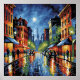 Uma pintura vibrante de paisagem urbana captando a magia de uma noite iluminada pela lua, com reflexões brilhando em uma rua molhada.