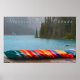 Uma fileira de canoas coloridas fica em uma doca de madeira, virada para um lago Moraine, Canadá, cercado por árvores verdes e exuberantes. A água é um azul turquesa vibrante, refletindo o céu coberto. O fundo apresenta uma pequena montanha, acrescentando um senso de tranquilidade à cena.