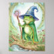 This poster features a whimsical wizard frog illustration: a cloaked, hat-topped green toad with a crystal staff in a mossy forest clearing by a babbling stream. Finished as a watercolor paint print.