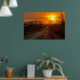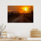 A moto anda numa estrada rural num pôr do sol. Laos. Poster de fotografia.