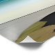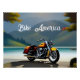 Uma bela moto está estacionada perto de um lago sob um céu azul nublado.