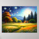 Bright colorful forest meadow with flowers, trees and cabin. Lots of art in my stores. Add this art to other products, add text.