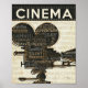 © Pela Studio / Maçã selvagem. Esta imagem de aparência antiga apresenta uma câmera preta e branca. A palavra Cinema é exibida de forma destacada na imagem, assim como em outros textos na imagem.