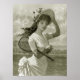 Linda mulher de cabelo comprido com vestido branco rico e chapéu segurando flores e raquete de tênis ou badminton. Artista impressão de 1887.