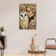 Um retrato aproximado de uma mulher com cabelo louro longo, seu rosto virou em perfil, olhos fechados e lábios ligeiramente separados. Ela é enfeitada com uma coroa de penas, e seu ombro está coberto numa cascata de penas. Uma grande coruja de celeiro com plumagem castanha e branca está presa contra sua bochecha, seus grandes olhos escuros olhando diretamente para o espectador. Presente perfeito para amantes de coruja.