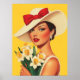 Uma mulher glamourosa de chapéu branco com arco vermelho, segurando um buquê de narcisos amarelos e brancos contra um fundo amarelo vibrante.