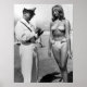 Foto em preto e branco de uma mulher de um biquíni que recebeu uma passagem por um policial.