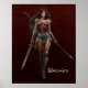 Veja esta arte quadrinhal muito detalhada para a Mulher Maravilha, ramificando uma arma em cada mão! Aqui ela segura a Espada da Justiça, uma longa lança, e tem um escudo nas costas.