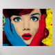 Uma mulher com cabelo vermelho e olhos azuis vibrantes cobrir seu rosto com as mãos luvadas. O fundo é brilhante com influências de pop.