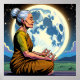 Meditação de Mulher Mais Velha debaixo de uma lua de cheio. Espiritual Iluminismo temático Poster num estilo de banda desenhada ilustração aérea hiperrealista.