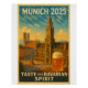 design do poster de viagens, intitulado "Munique 2025 - Saber o Espírito Bávaro", que mostra a animada praça Marienplatz com o grande Neues Rathaus (Nova Câmara Municipal) em cheio detalhe gótico