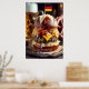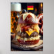 Mergulhe em uma experiência de Munique com este desprezível Burger Alemão de Beerhouse. Uma carne de bovino espessa, suculenta e impregnada por bratwurst, grelhada à perfeição saborosa, é colocada com queijo de gouda derretido, molho picante, e um caldo generoso de mostarda de grãos inteiros. Tudo aninhado entre um pão de pretzel torrado. Uma pequena bandeira alemã acrescenta um toque festivo, enquanto um fundo desfocado aponta para uma caneca de cerveja refrescante de cerveja, completando esta alegria culinária alemã.
