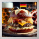 Mergulhe em uma experiência de Munique com este desprezível Burger Alemão de Beerhouse. Uma carne de bovino espessa, suculenta e impregnada por bratwurst, grelhada à perfeição saborosa, é colocada com queijo de gouda derretido, molho picante, e um caldo generoso de mostarda de grãos inteiros. Tudo aninhado entre um pão de pretzel torrado. Uma pequena bandeira alemã acrescenta um toque festivo, enquanto um fundo desfocado aponta para uma caneca de cerveja refrescante de cerveja, completando esta alegria culinária alemã.
