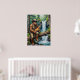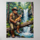 Esta cativante obra de arte captura um momento de confiança entre Pé-grande, usando um chapéu de cowboy, e um pequeno cervo aninhado perto dele, próximo a uma pitoresca cachoeira. A floresta exuberante fornece um cenário vibrante. Os traços grossos e texturizados trazem a cena à vida, enfatizando o vínculo tácito entre as duas figuras improváveis no coração da natureza.