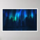 Shimmers de aurora azul e verde acima de uma floresta norte.