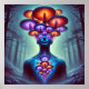 Um trabalho de arte surreal e simbólico representando uma figura humanoide luminosa com cogumelos vibrantes e brilhantes brotando de sua cabeça e peito. Colocada em uma floresta encantada, nebulosa, essa peça visionária representa transformação, consciência expandida, e a profunda simbiose entre a mente humana e a natureza. Os fungos radiantes simbolizam o iluminismo psicodélico, o crescimento espiritual e a interconectividade ilimitada da existência. O brilho etéreo e a atmosfera sonhadora evocam uma sensação de misticismo, guiando o espectador num reino de introspecção e transcendência.