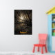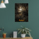 Este poster de Halloween apresenta um céu noturno místico. O ar está permeado com névoa. A lua de cheio que brilha através das árvores acende as nuvens negras em tons de ouro, laranja amarelo, branco e marrom e forma um interessante padrão de abstrato. O texto diz: Cuidado. Ele pode ser personalizado para atender às suas necessidades.