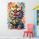 * **Face:** It has a fierce yet somewhat adorable expression, with **large, expressive eyes** and a wide-open mouth displaying **sharp white fangs** and a red tongue. Its nose is a prominent **bright red bulb**.